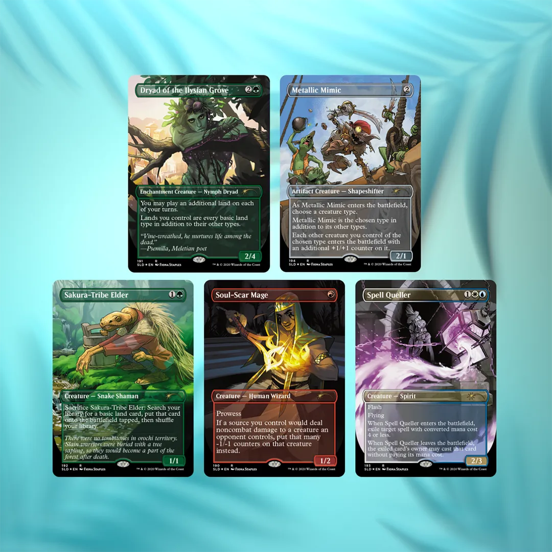 You would not believe what Fiona Staples said when we asked her if she wanted to illustrate a Secret Lair Drop. She said, “Yes.” Well, since you’re looking at this product page you probably believe it pretty easily, but we still think we’re dreaming. The Fiona Staples, award-winning comic book artist known for her emotive art and compelling characters, has entered the Magic arena! (Not that one.) She directed her unbelievable reserves of talent towards five sweet cards—cards that can be yours, right now.